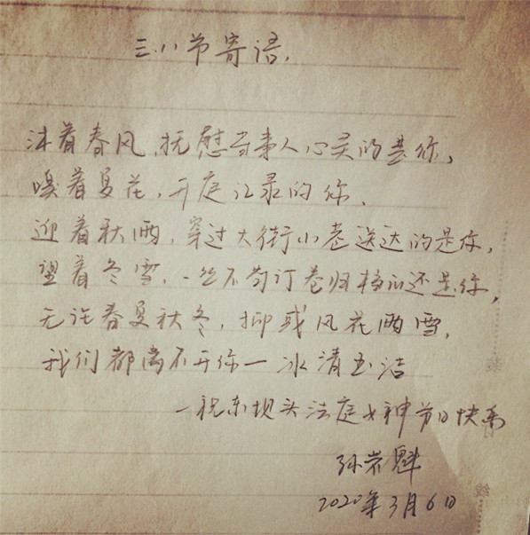 在三八国际妇女节来临之际,为丰富全院干警的文化生活,缓解疫情引起的不良情绪,兰考法院面向全院干警发起了温情寄语活动,以下是对女干警的部分温情寄语展示: